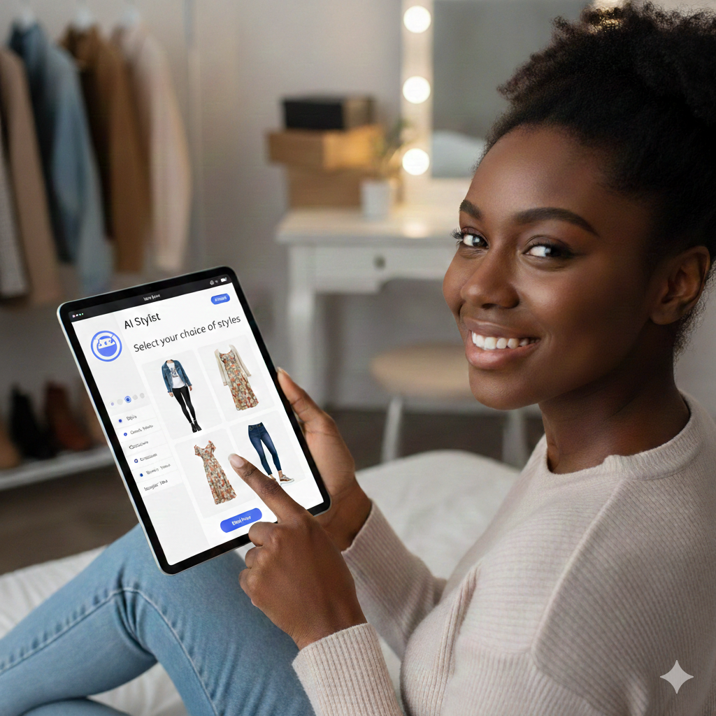 A digital fashion product with an embedded AI stylist agent that helps users discover outfits, mix and match items, and make purchase decisions based on style, occasion, and budget